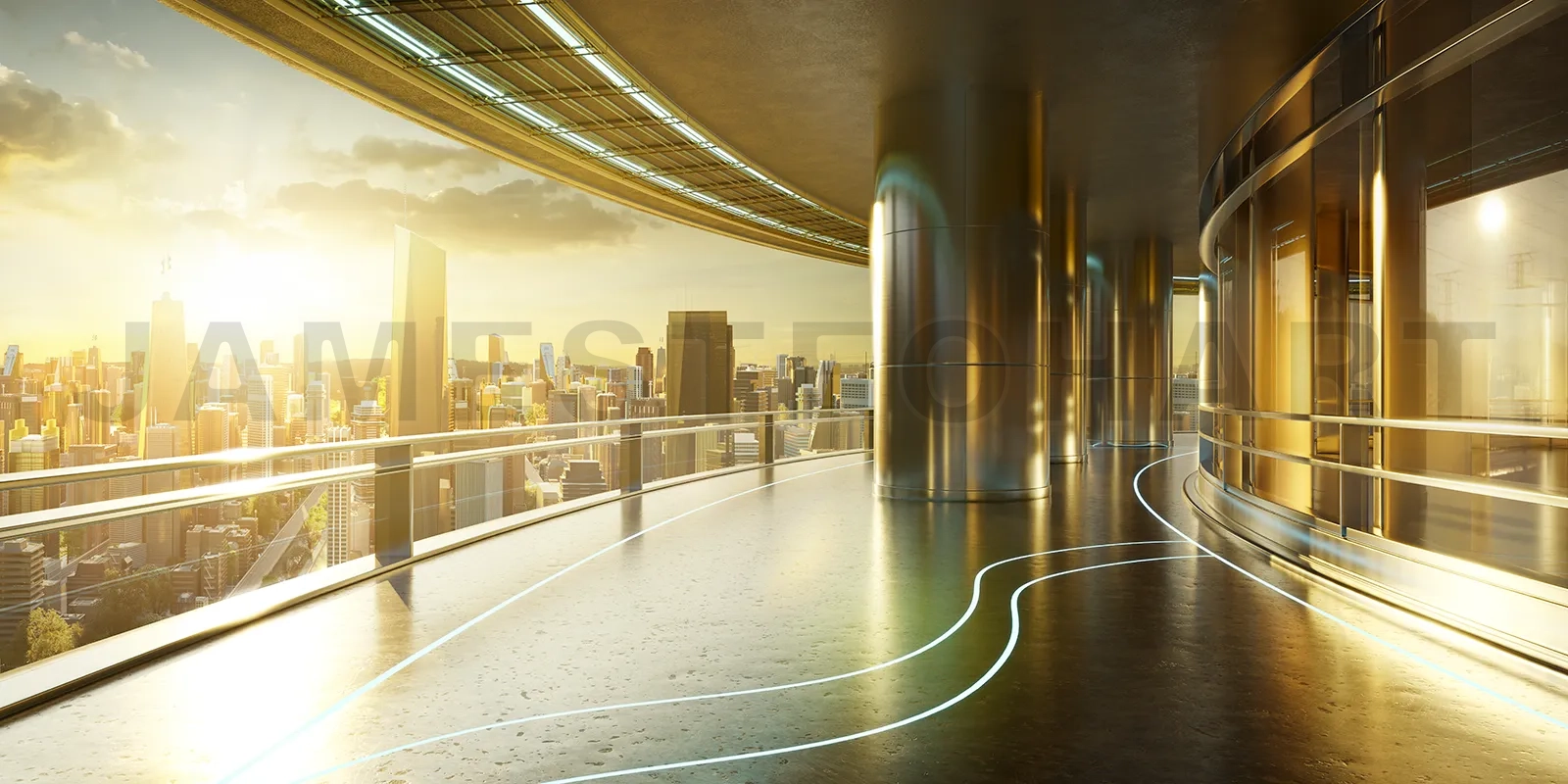 Panoramic view of futuristic curved shapes design metal facade office exterior with stunning sunrise city skyline. 3D rendering