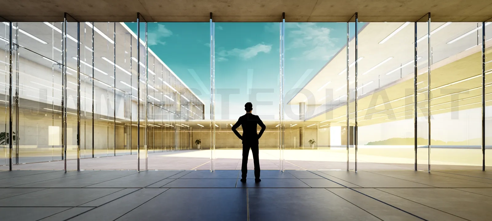 Silhouette of a man standing in a spacious glass-walled corridor with a view of the sky. 3D rendering