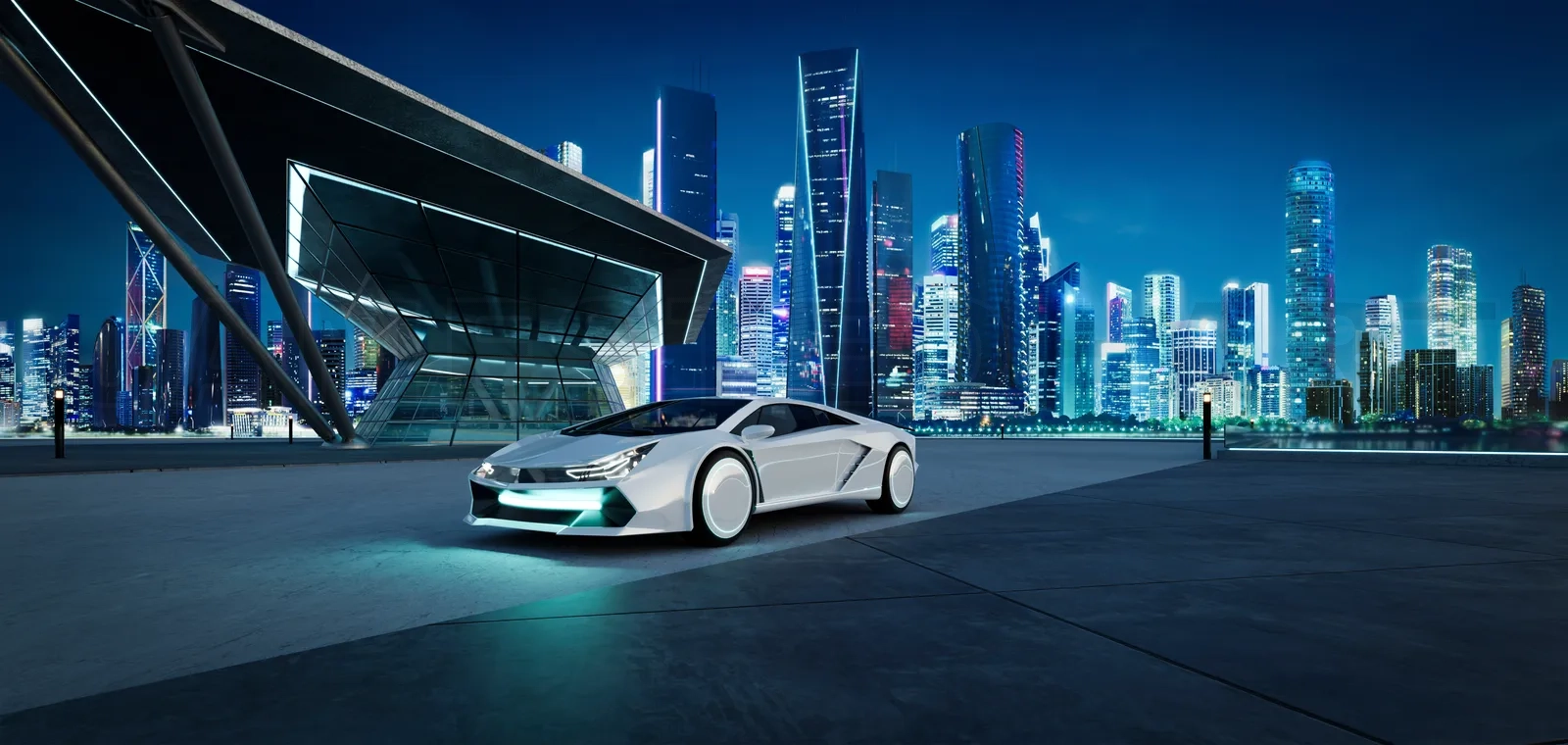 Empty cement floor with modern building exterior and brandless electric EV car. 3d rendering