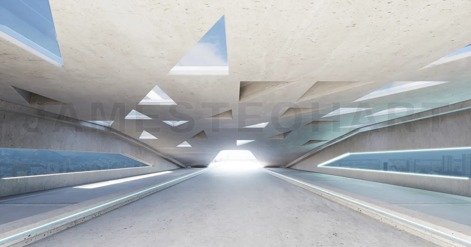 Empty concrete floor and roof interior architecture with triangular element design. 3D rendering