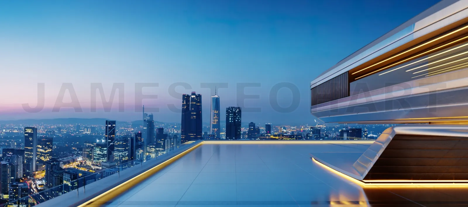 Modern rooftop lounge with stunning cityscape view during sunset, offering luxurious and futuristic ambiance. 3D rendering