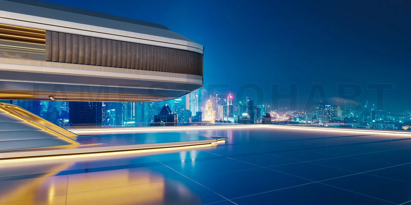 Modern rooftop architecture overlooking a vibrant cityscape at night, creating a futuristic and luxurious atmosphere. 3D rendering