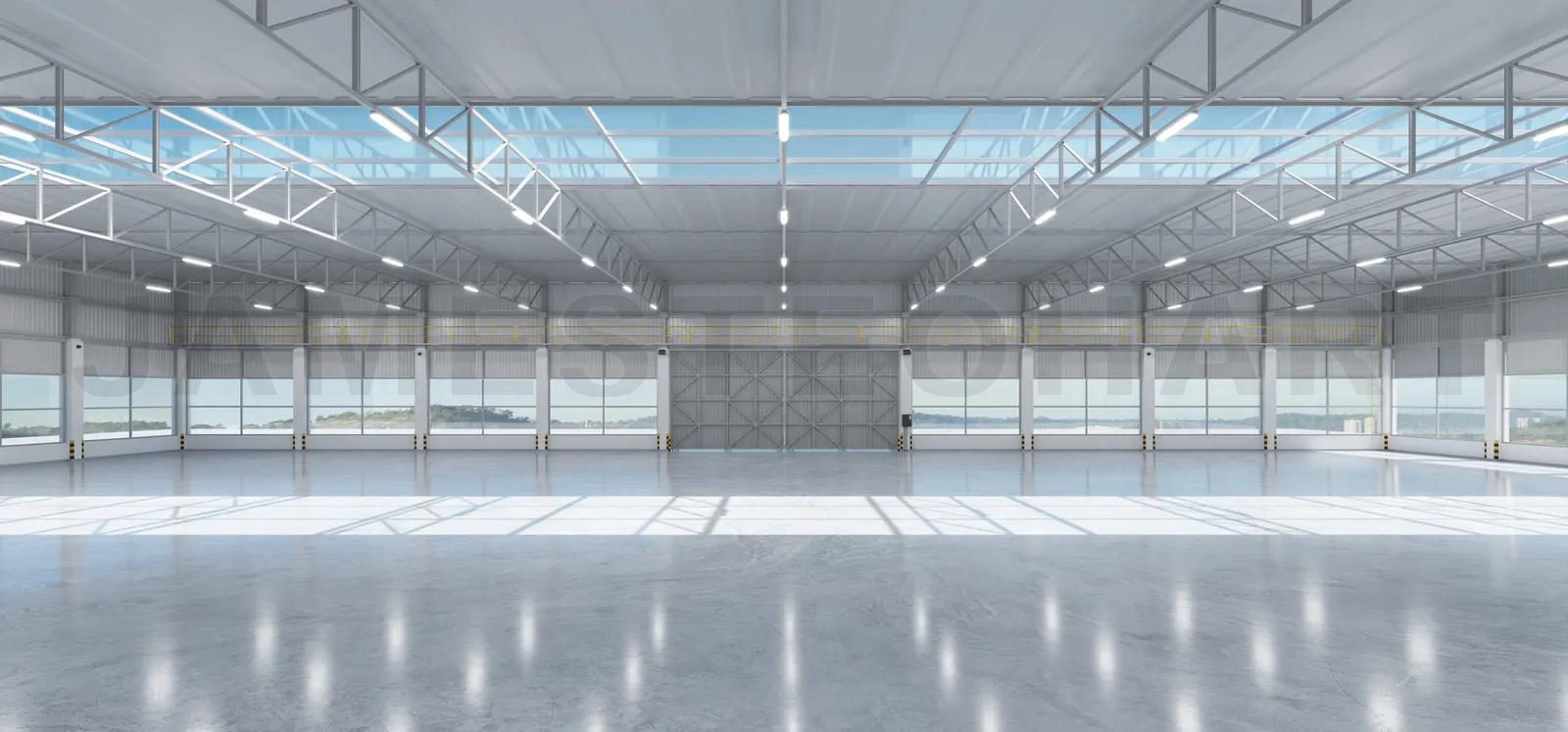 Industrial building warehouse interior with polished concrete floor and style transparent glass roof top. 3d rendering