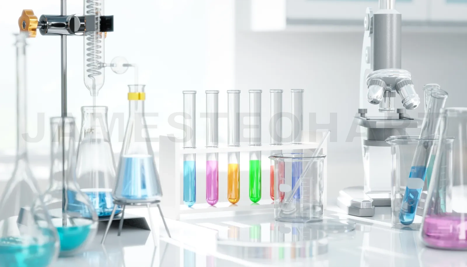 Glassware filled with colorful chemicals in modern laboratory setting with microscope, suggesting ongoing experiment. 3d rendering