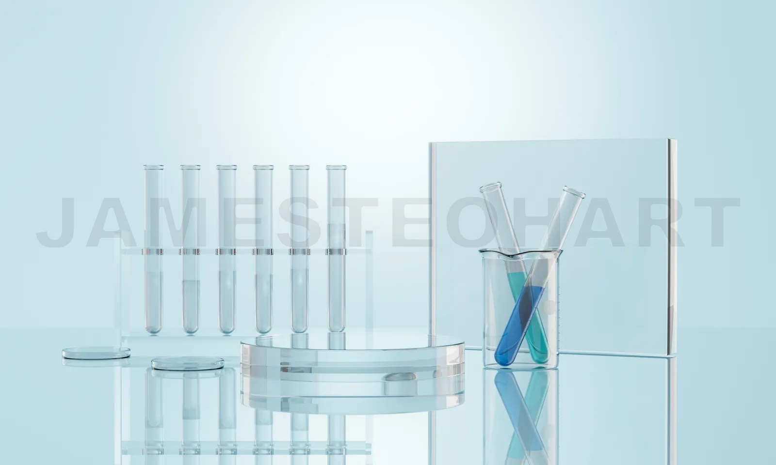 Test tubes and beakers filled with blue and green liquids stand on a reflective surface in laboratory setting. 3D rendering