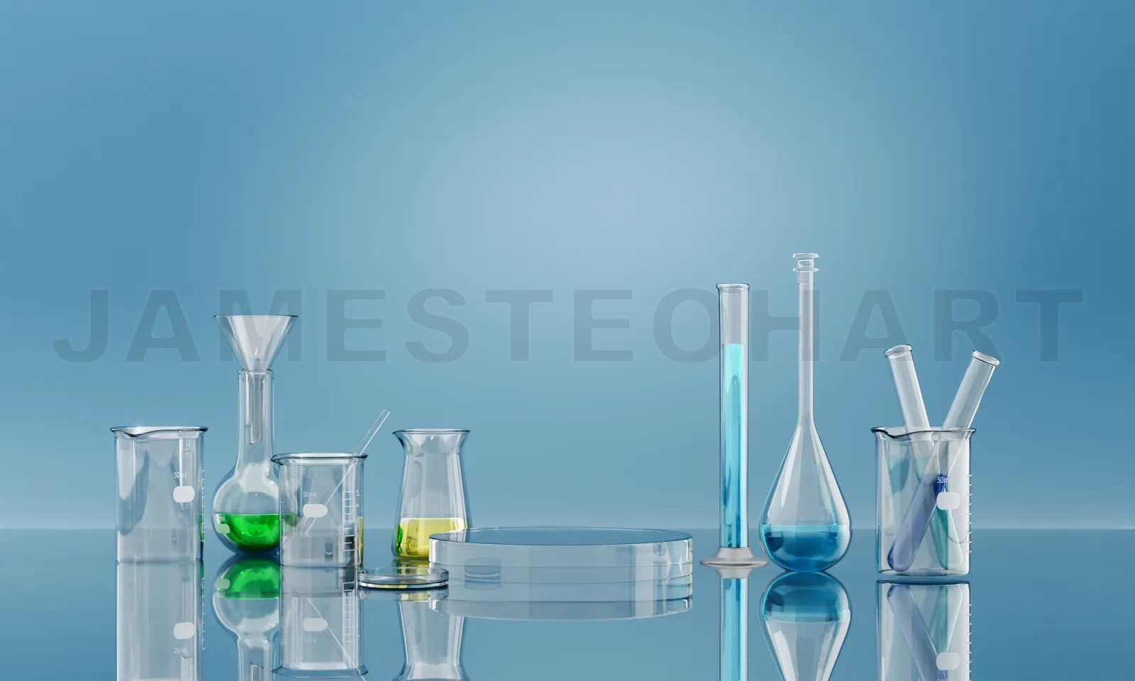 Glassware containing colored chemical liquid forming a laboratory equipment composition. 3D rendering