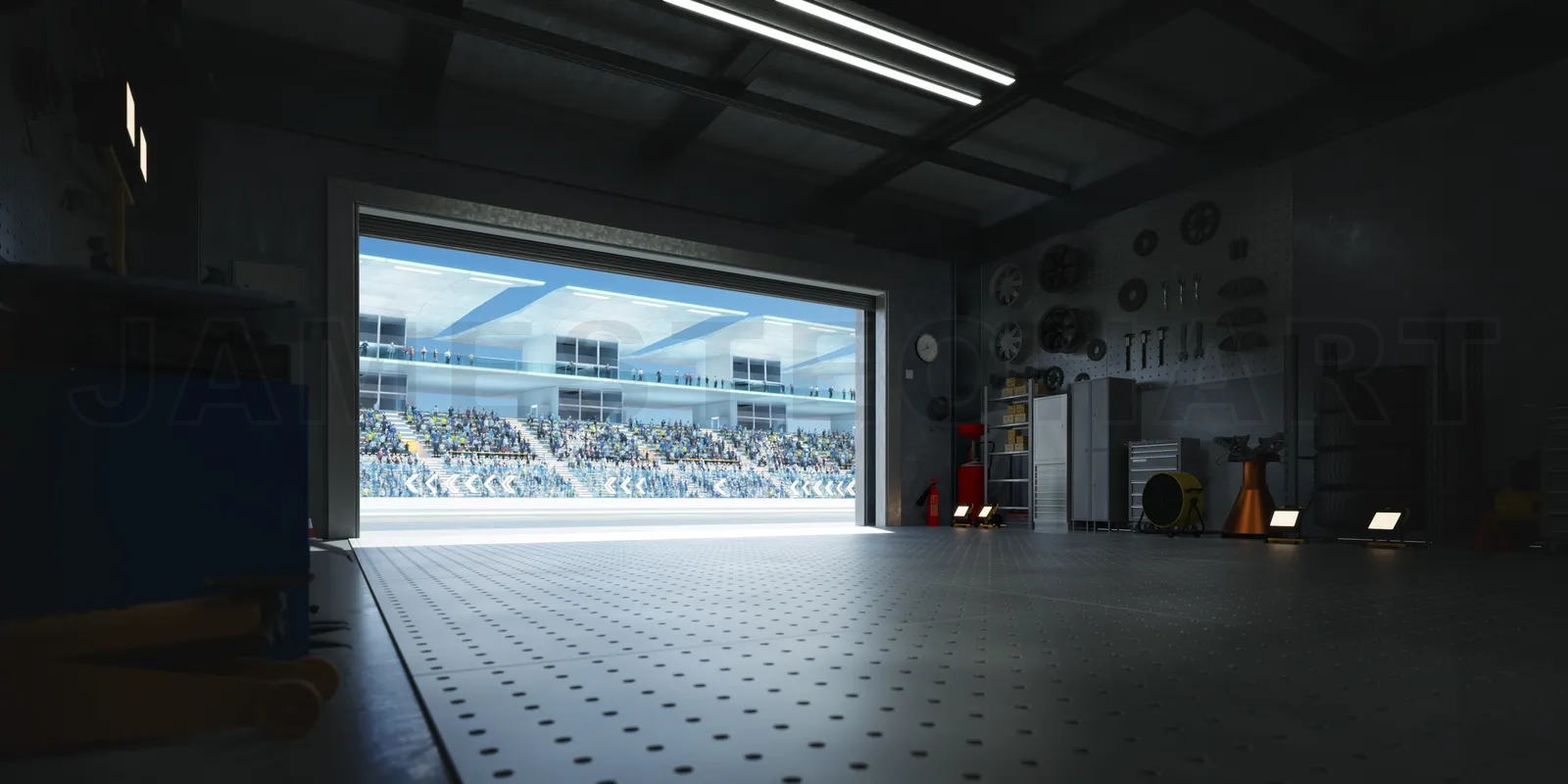 View of a large garage with open door leading to a stadium full of people waiting for a race. 3D rendering