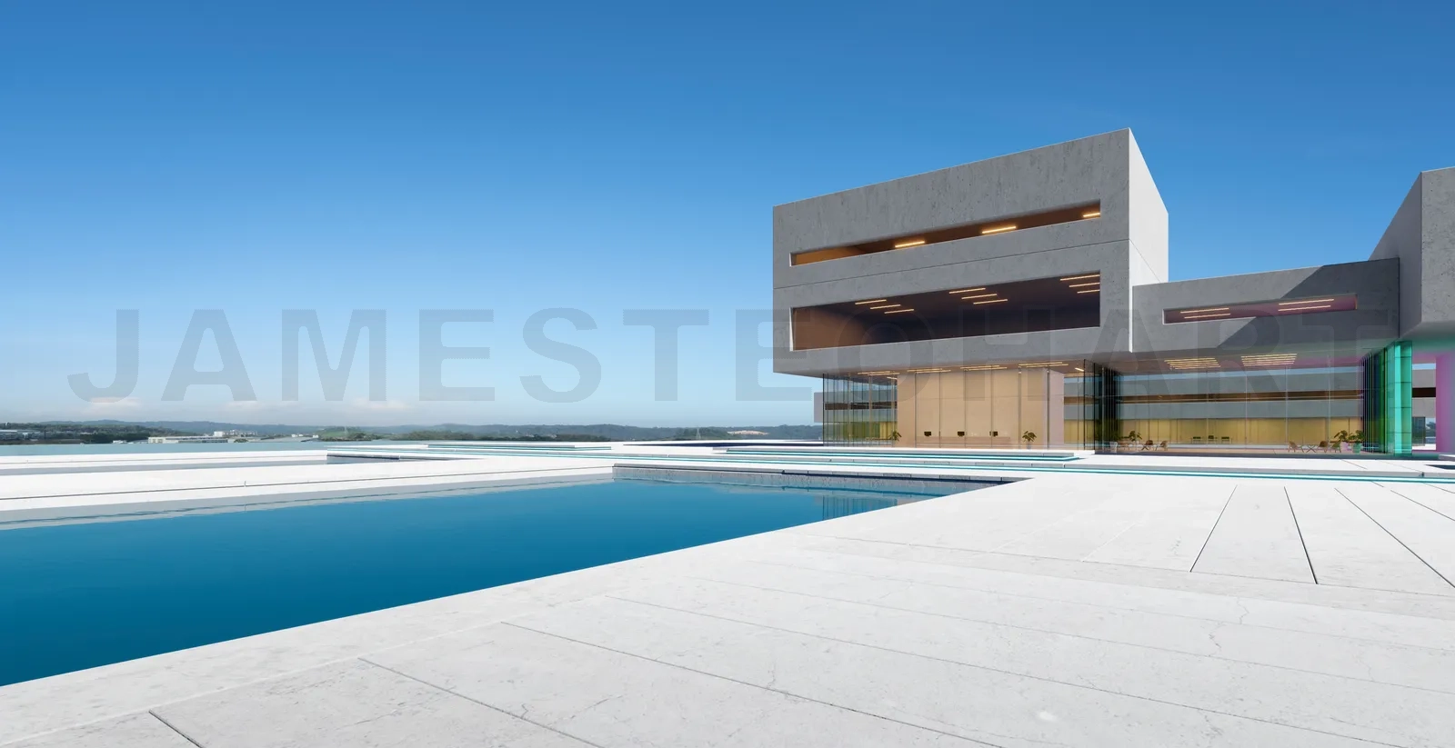 Modern architecture with a pond, concrete and glass facade, minimalist style design, blue skies, 3D rendering