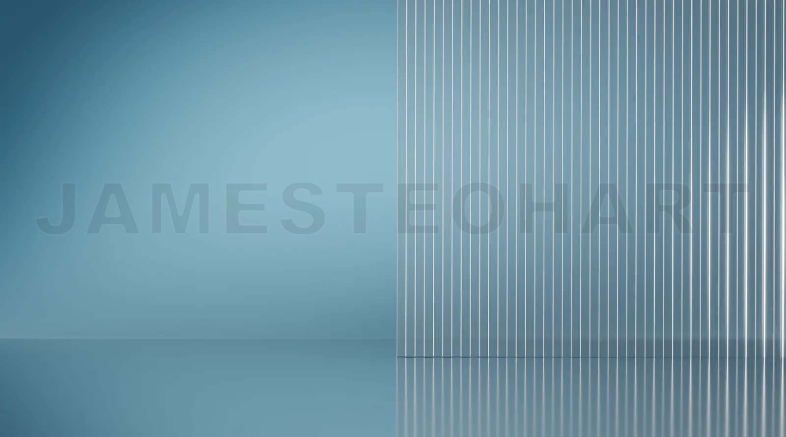 Modern empty room with vertical pale blue stripes reflecting on the floor. 3D rendering