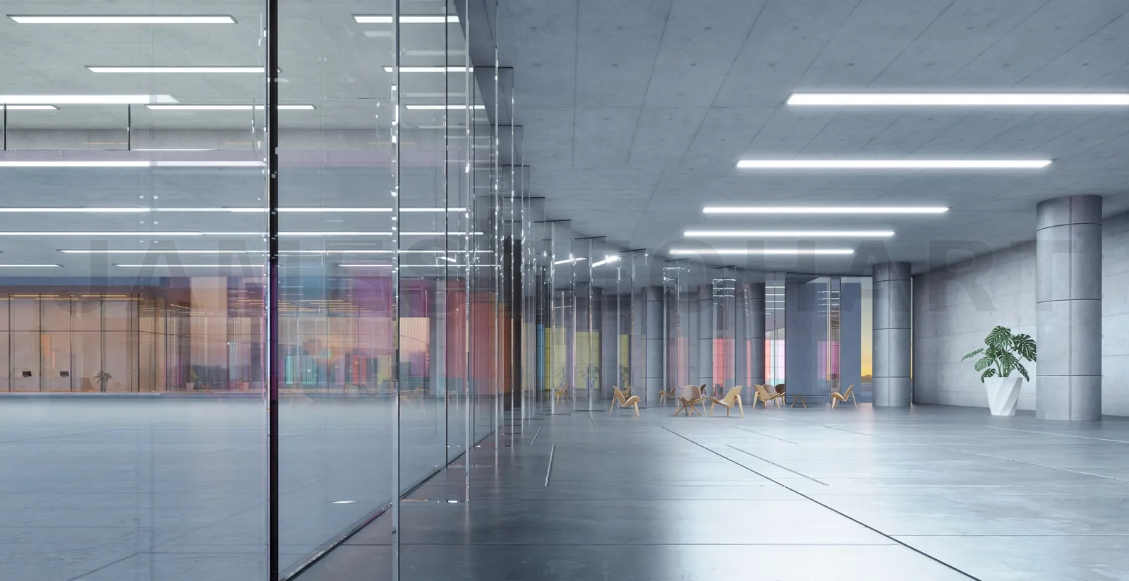 Modern glass wall commercial buildings lobby hall. Realistic 3d rendering