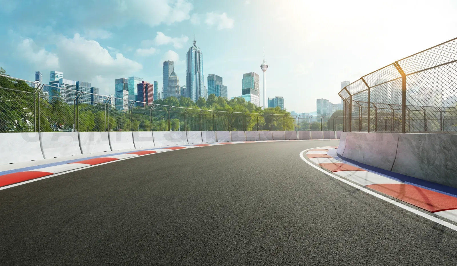 Racetrack with railing and city background, daytime scene. 3d rendering