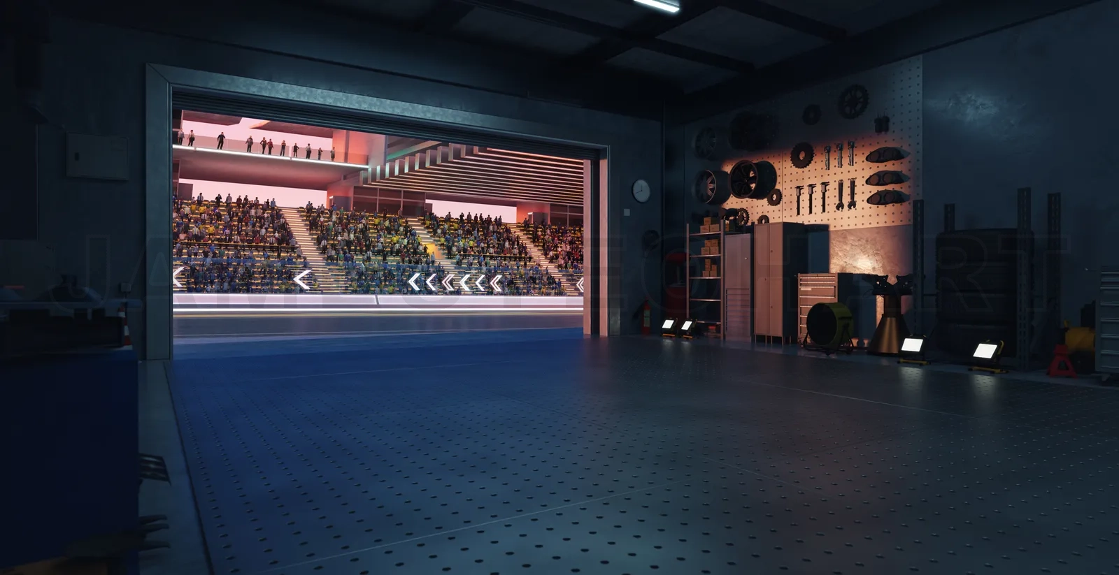 Inside view of a motorsport garage leading to a futuristic racing stadium with spectators, offering a unique perspective on the world of speed and competition. 3D rendering