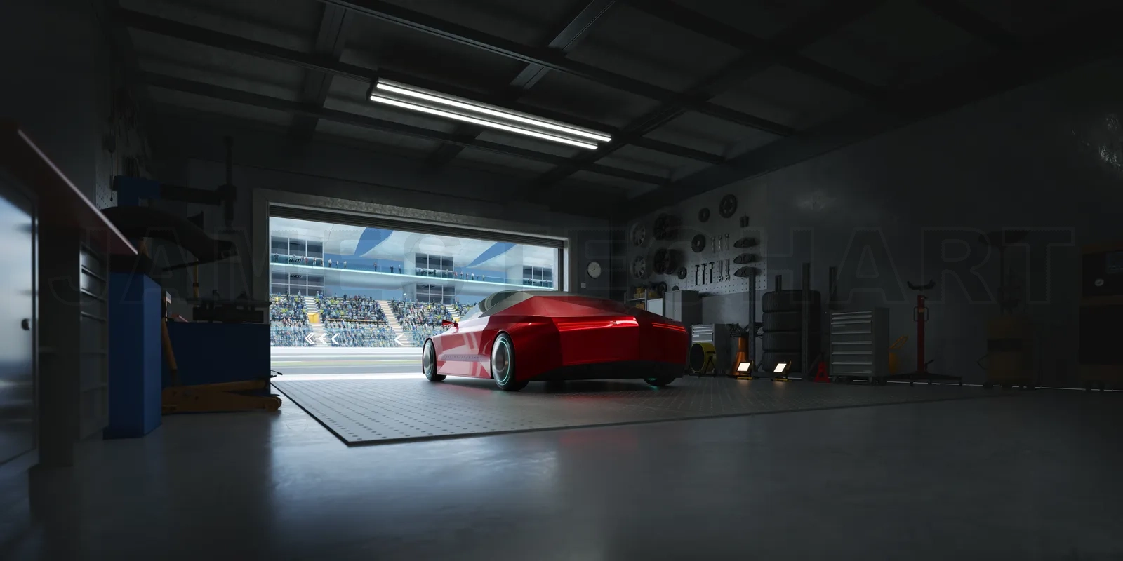 Red electric sports car is parked inside a garage facing a race track with spectators cheering. 3D rendering