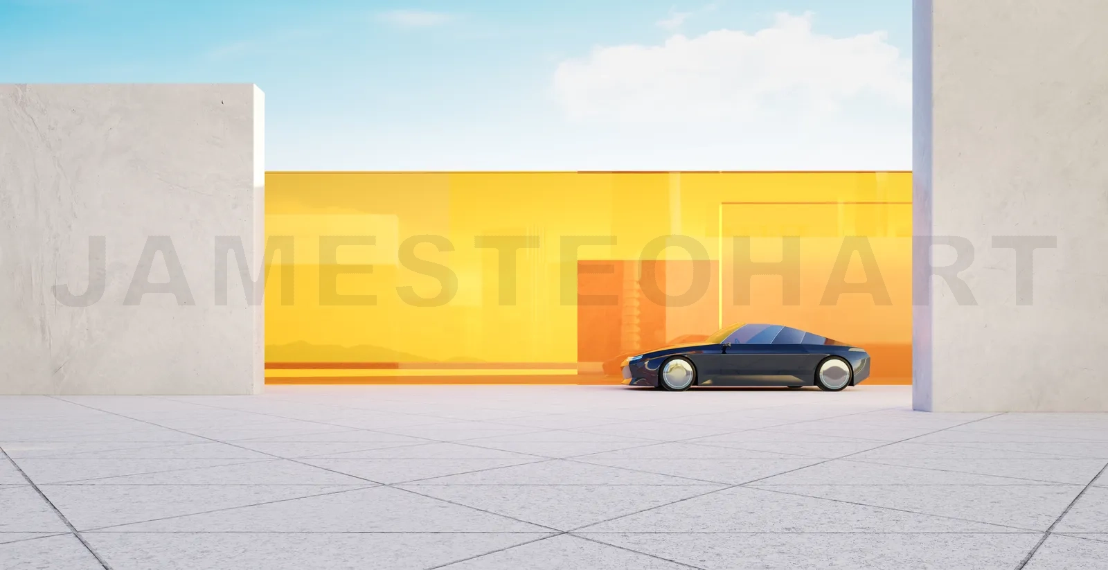 3d rendering of a futuristic car parked in front of an orange glass wall in a modern architectural setting
