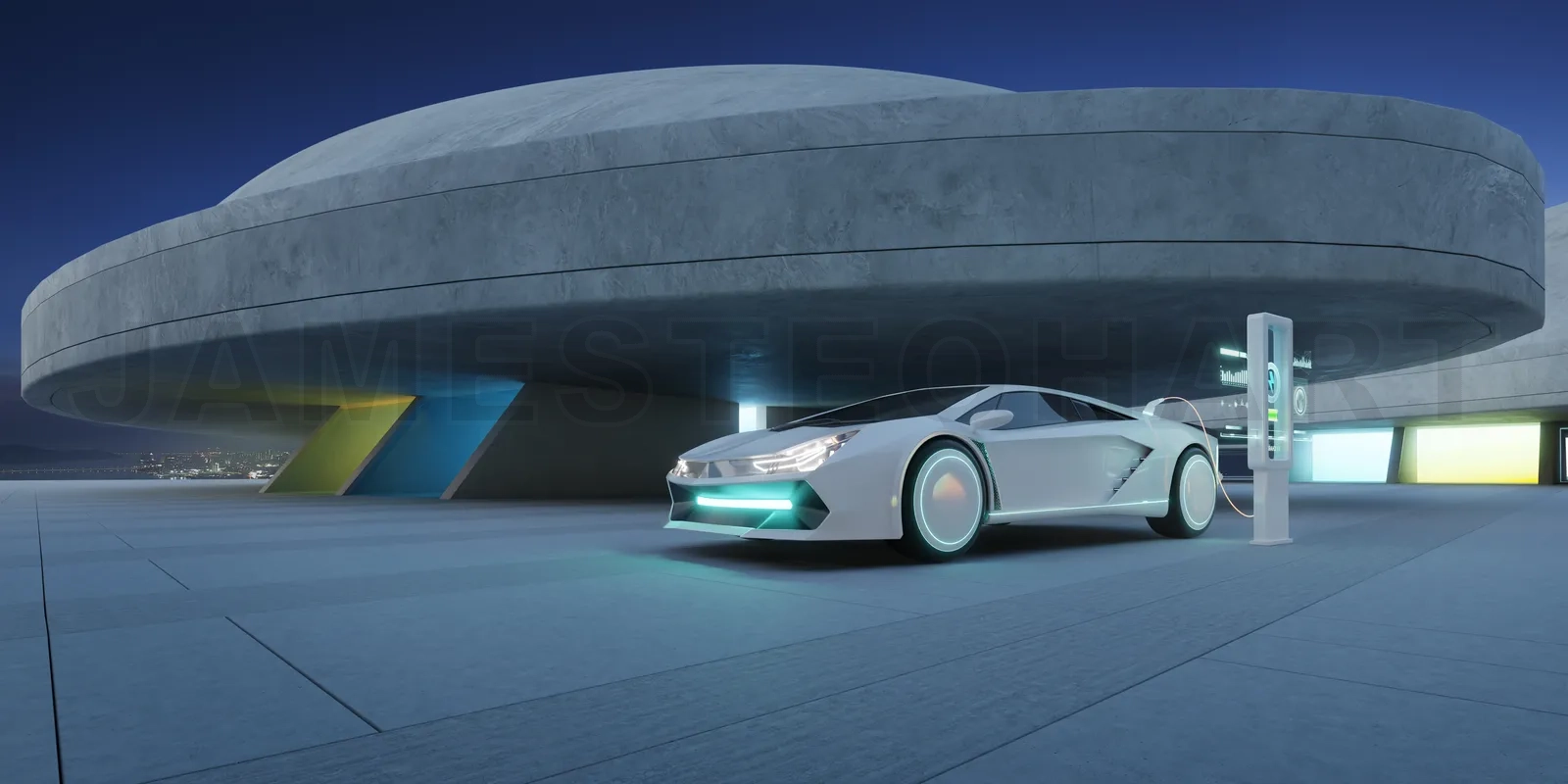 White electric sports car charging at futuristic station under concrete building at night with city lights in background. 3D rendering