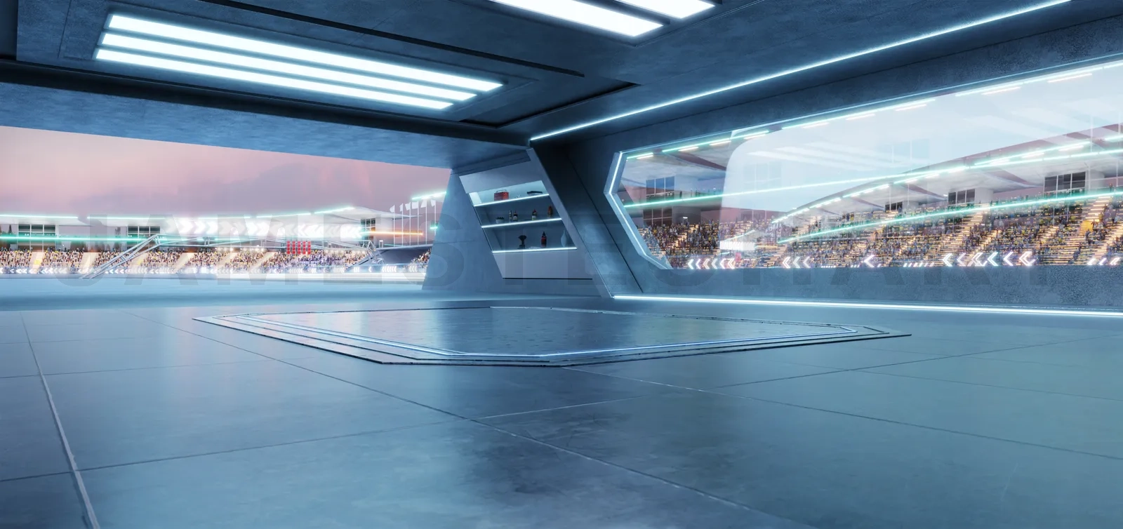Empty futuristic garage space overlooking a vibrant, illuminated race track with cheering spectators during an evening race. 3D rendering