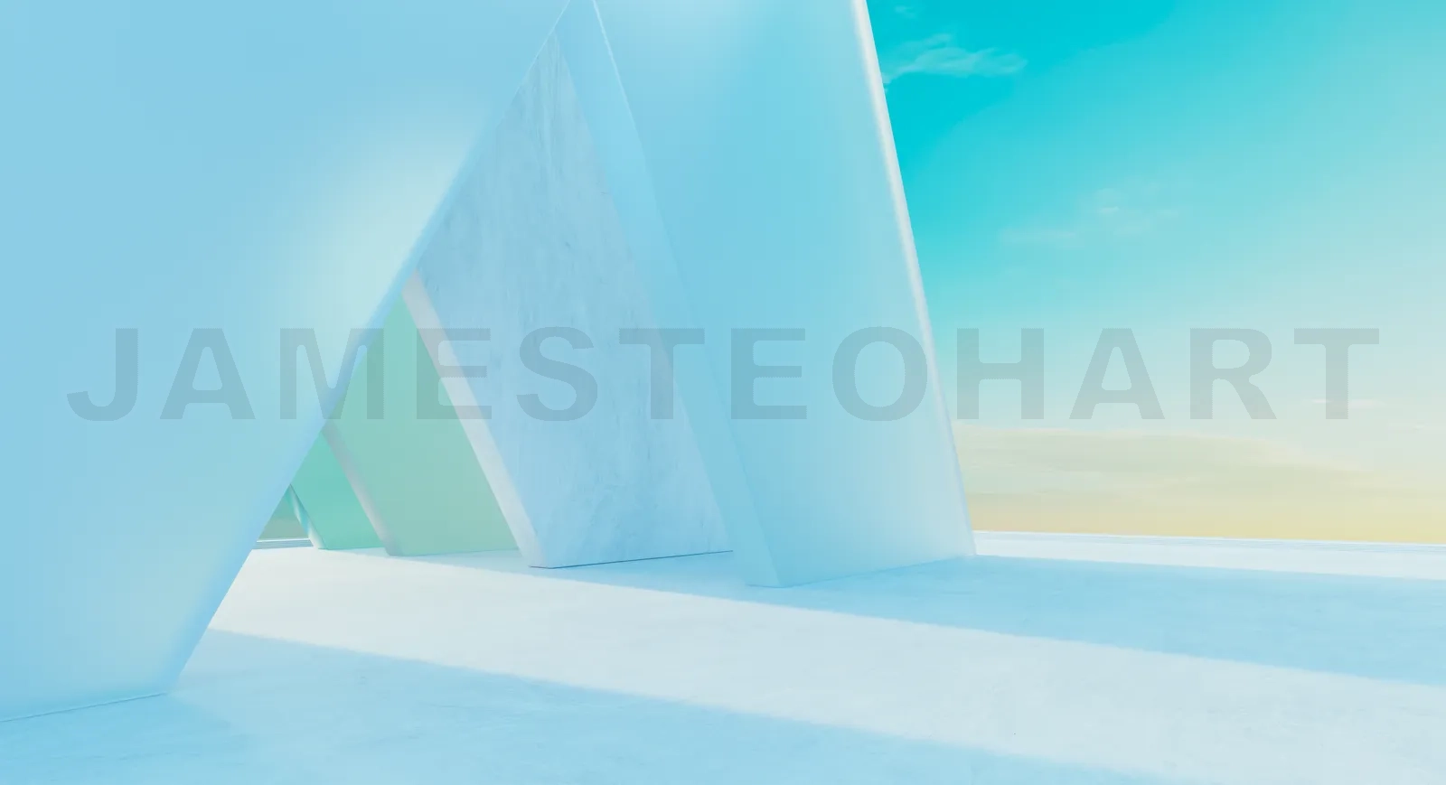 Sunlight illuminating modern architectural space with glass and concrete walls under blue sky. 3d rendering