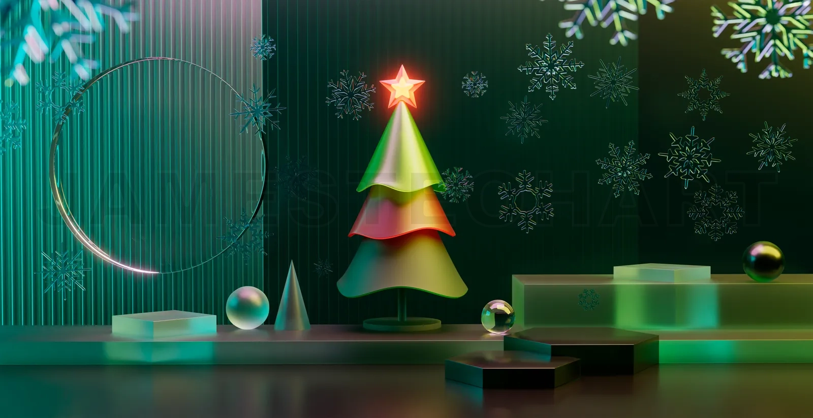 Abstract winter holiday backdrop with a modern glowing christmas tree and geometric elements. 3d rendering