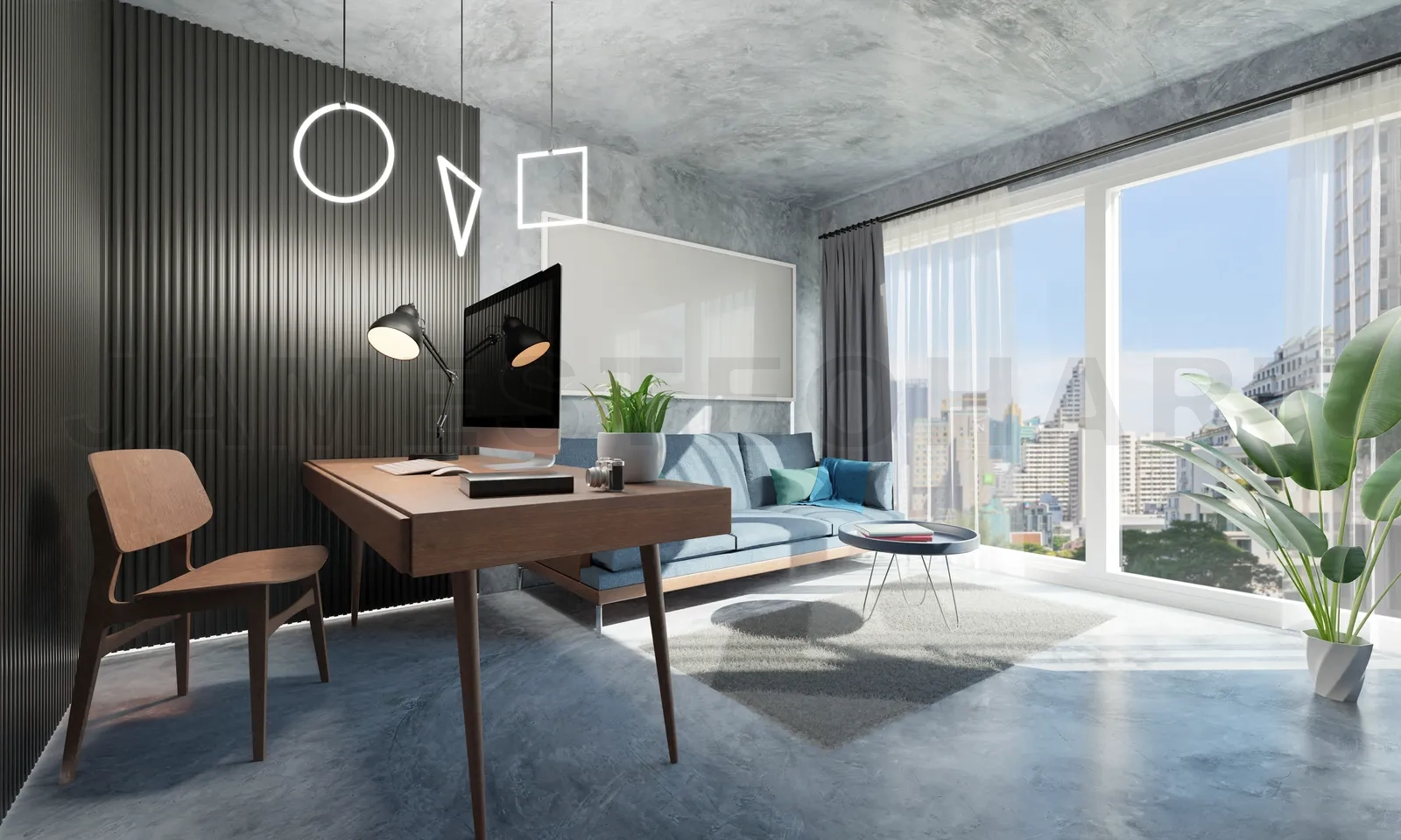 Home office interior with desk, computer, plant, furniture and window with city background. Photorealistic 3d rendering