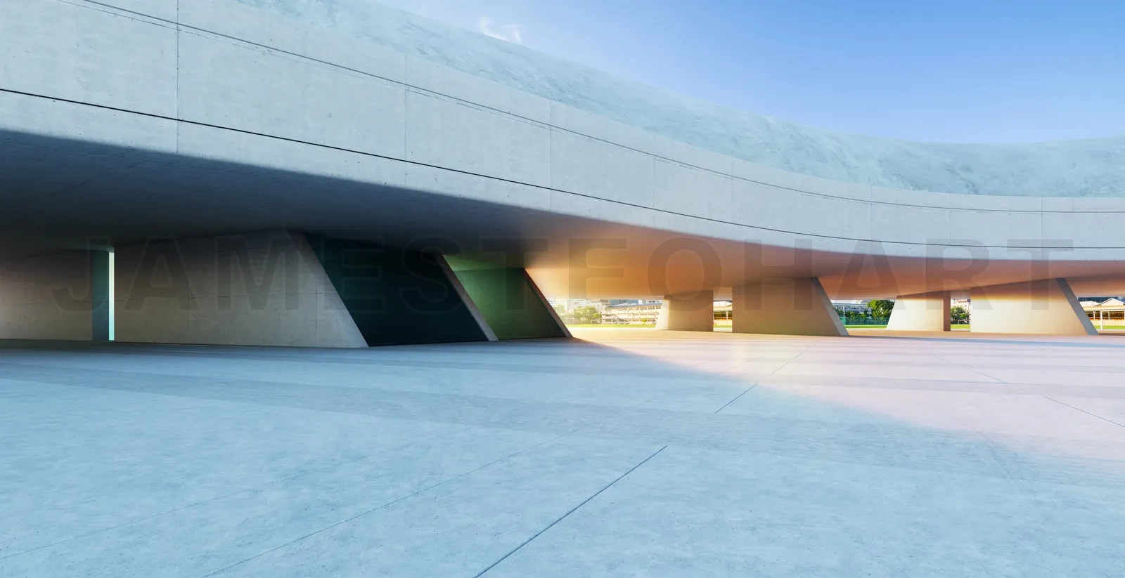 Empty space under a modern concrete building exterior at sunset. 3d rendering