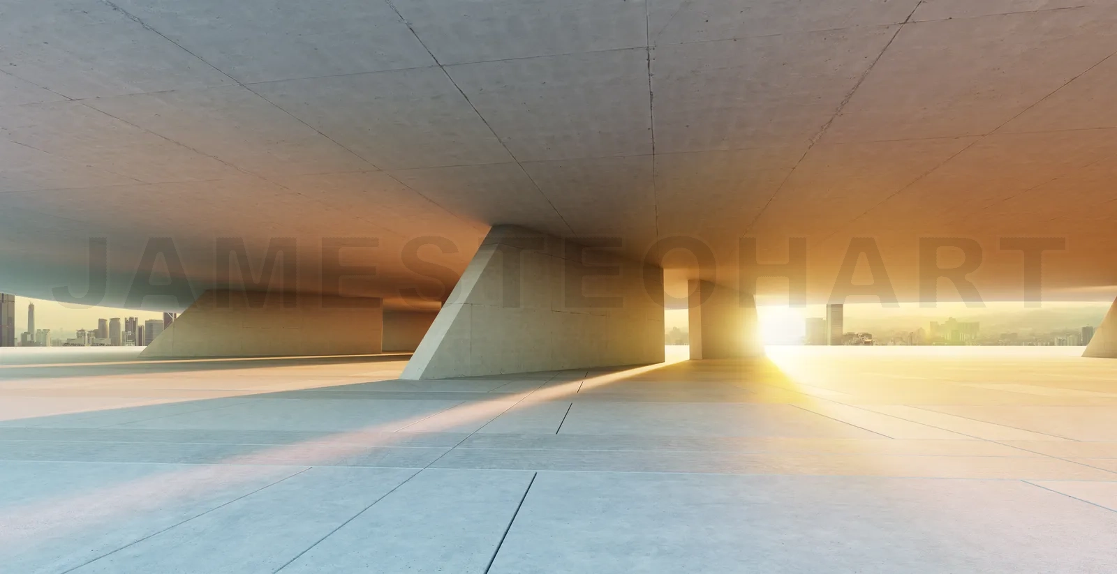 Empty concrete space under modern building overlooking city skyline at sunrise. 3D rendering