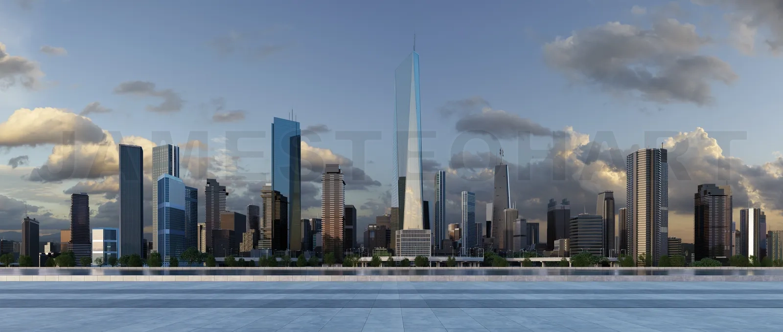 Modern city with a beautiful view and empty floor in front. 3d rendering