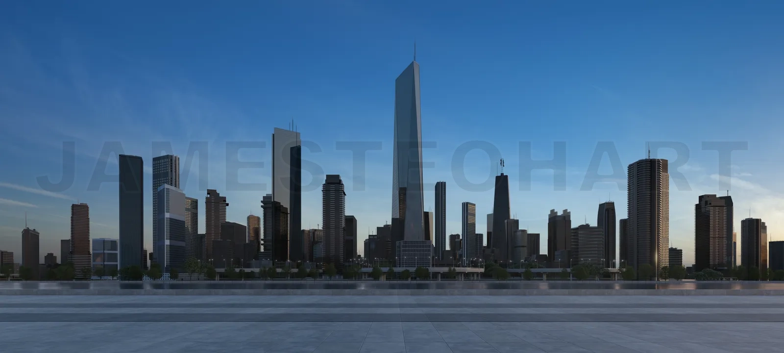 3D rendering of a modern city with a beautiful view and empty floor in front