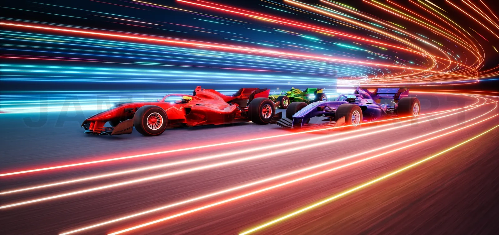 Racing cars racing on futuristic track with light trails. 3d rendering
