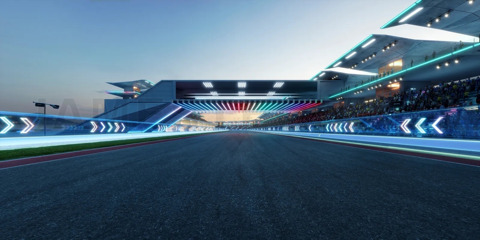 3d rendering racing concept of evening scene futuristic racetrack with glass railing and neon light decoration