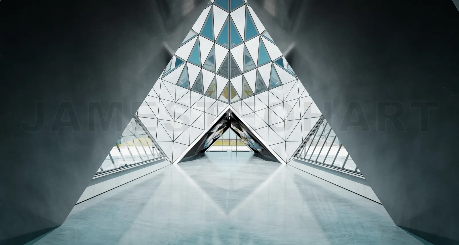 Abstract triangle shape design modern Architecture building interior with glass, concrete and steel element. 3D rendering.