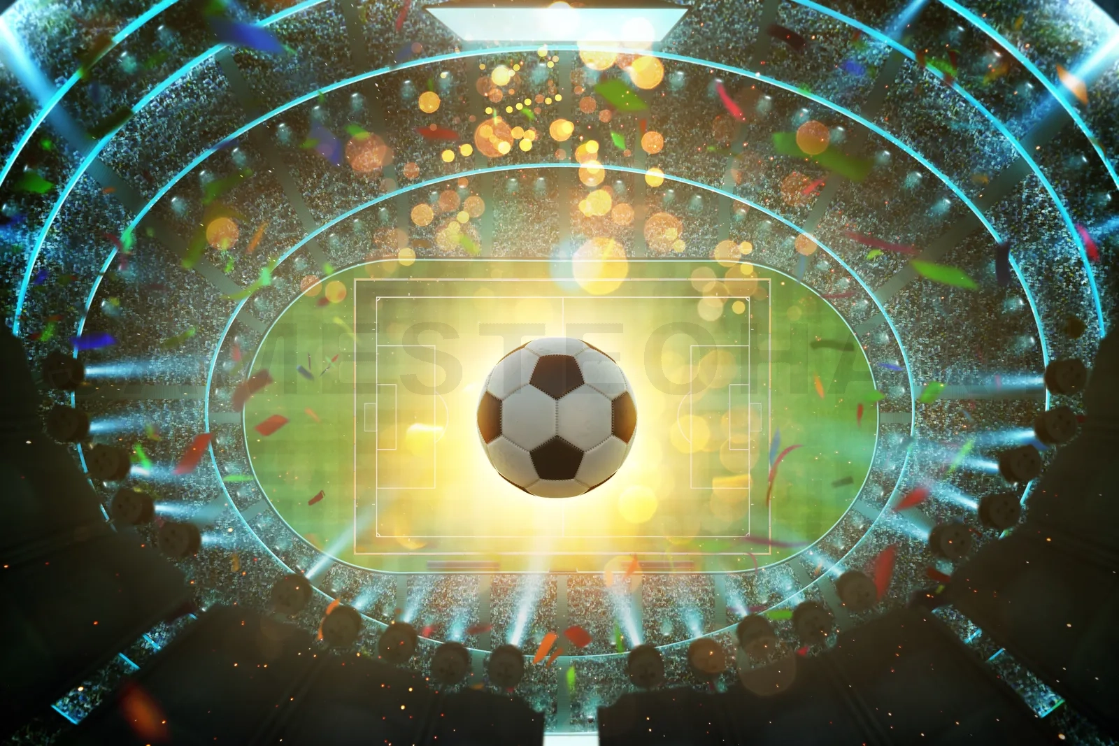 Aerial top angle view of imaginary soccer stadium with illumination . 3D rendering .