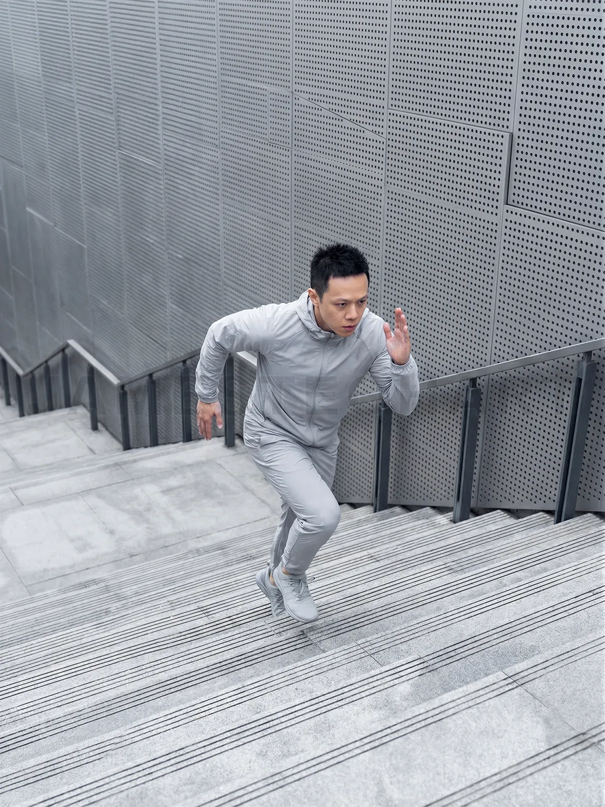 Concentrating man running up concrete stairs, exercising in modern city environment
