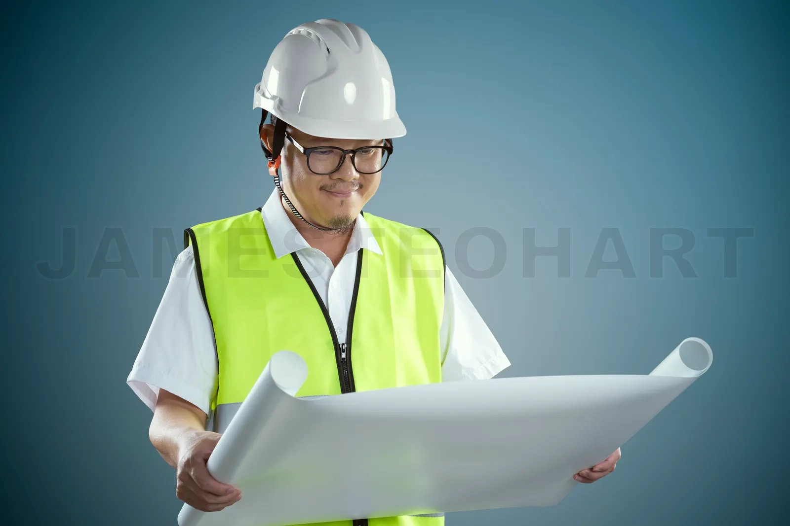 Asian engineer man smiling and holding a blueprint, wearing a hard hat and safety vest