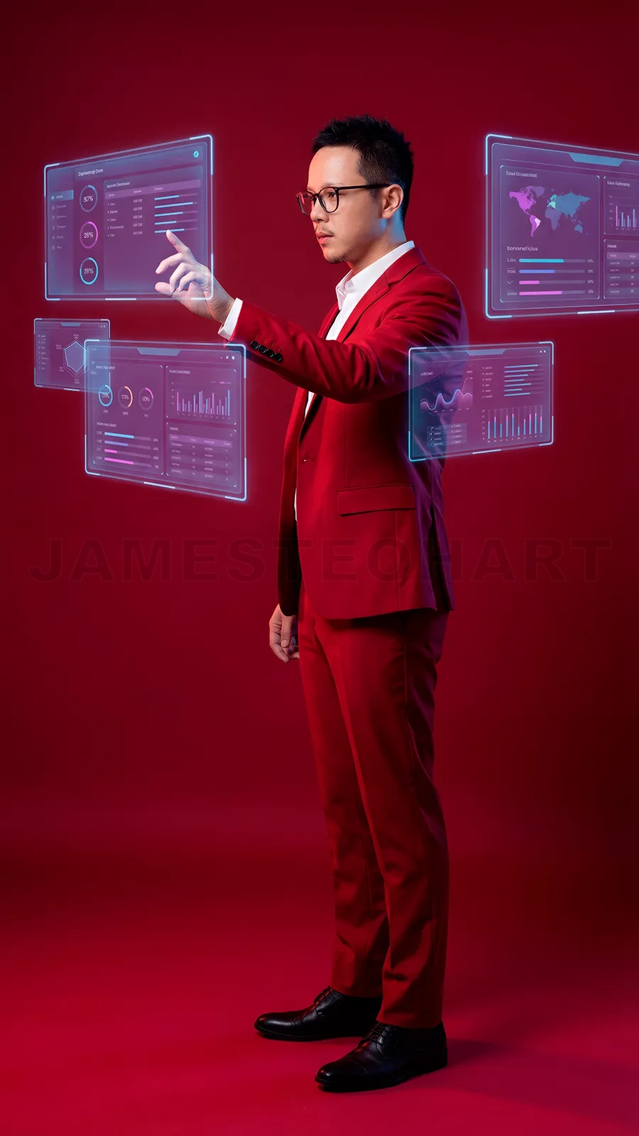 Asian man in red suit interacting with floating virtual screens showing data analysis and charts