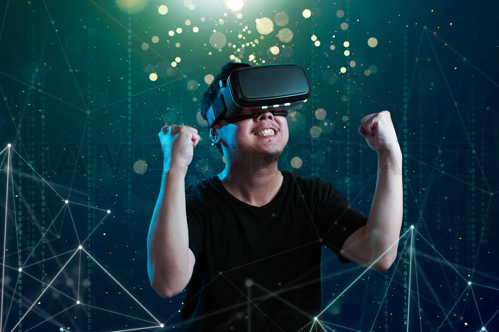 Asian man wearing virtual reality goggles in cyberspace imaging.