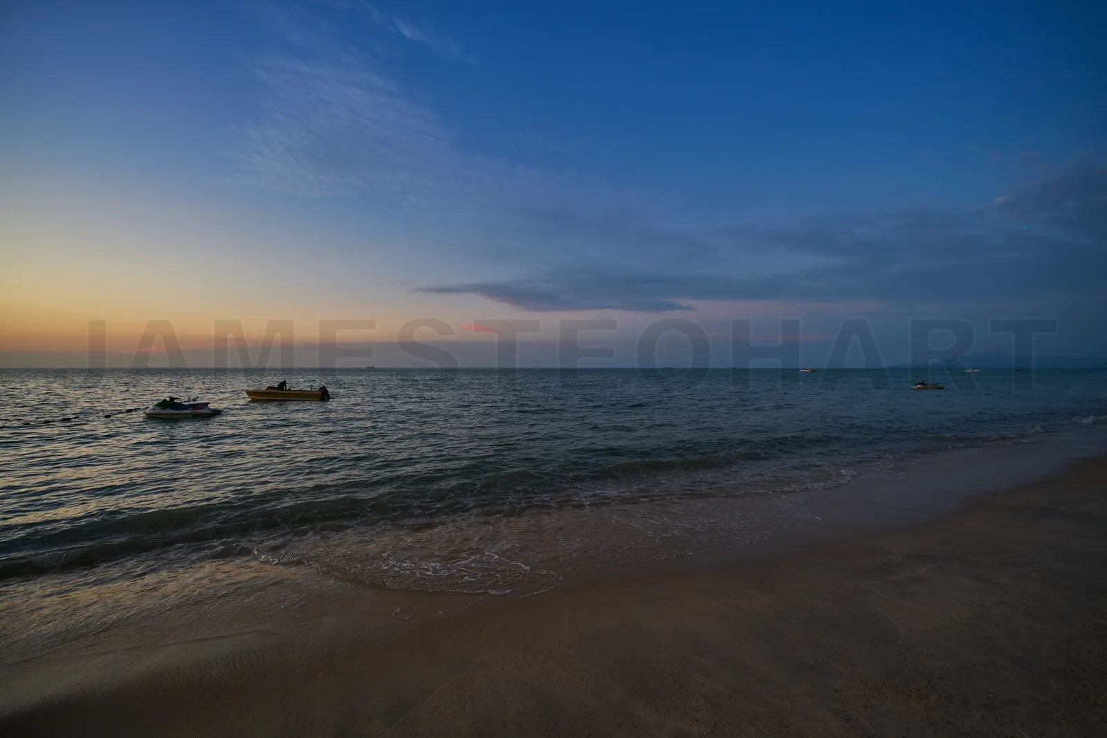Small boats awaiting passengers at twilight on a serene malaysian beach