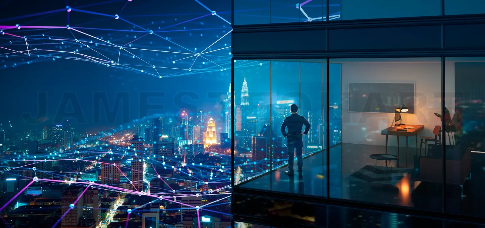 Businessman looking at a connected smart city from his office at night