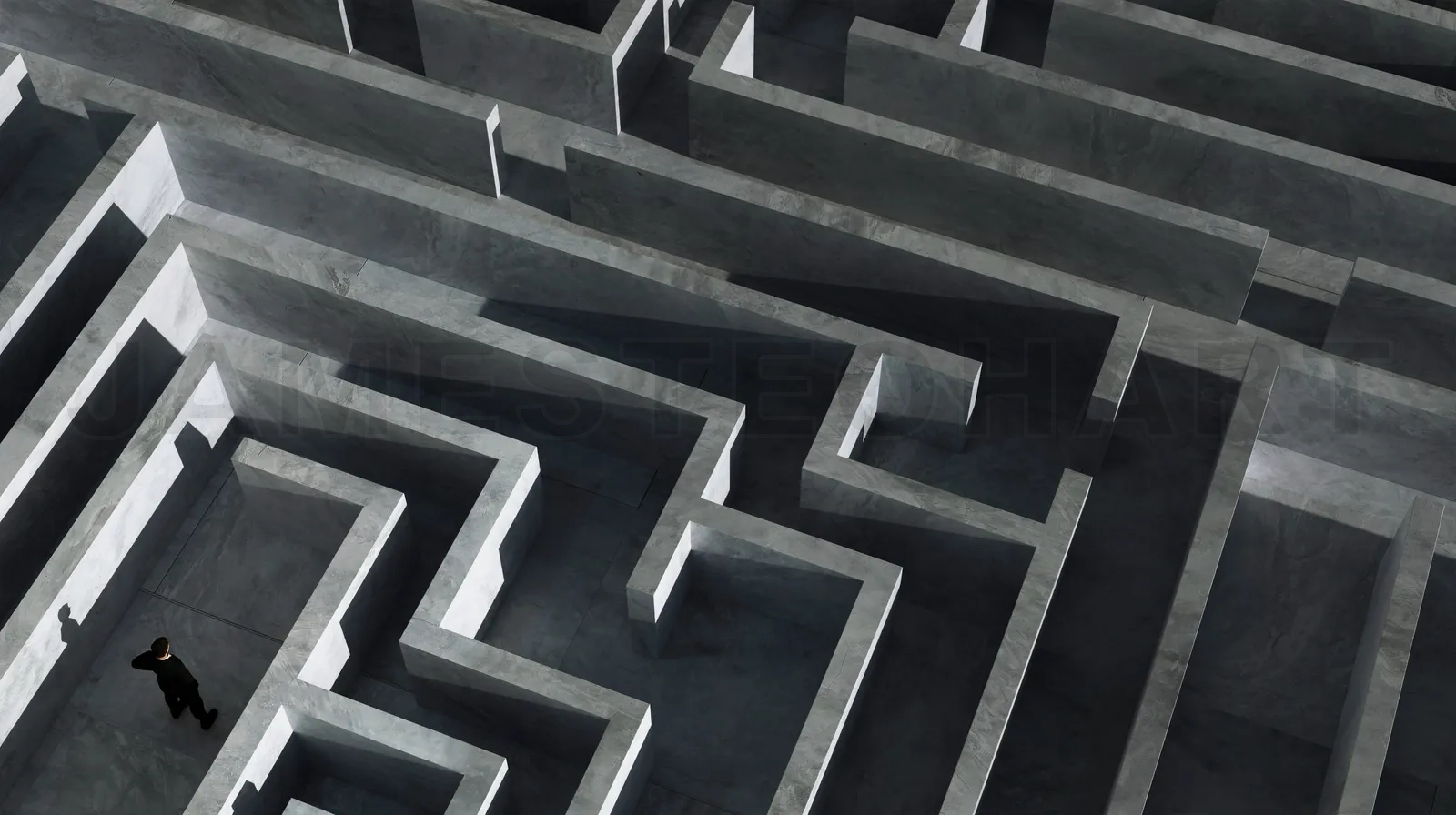 Businessman stand in front of maze entrance. Business problem solving, making decision, finding solution and challenge concept.