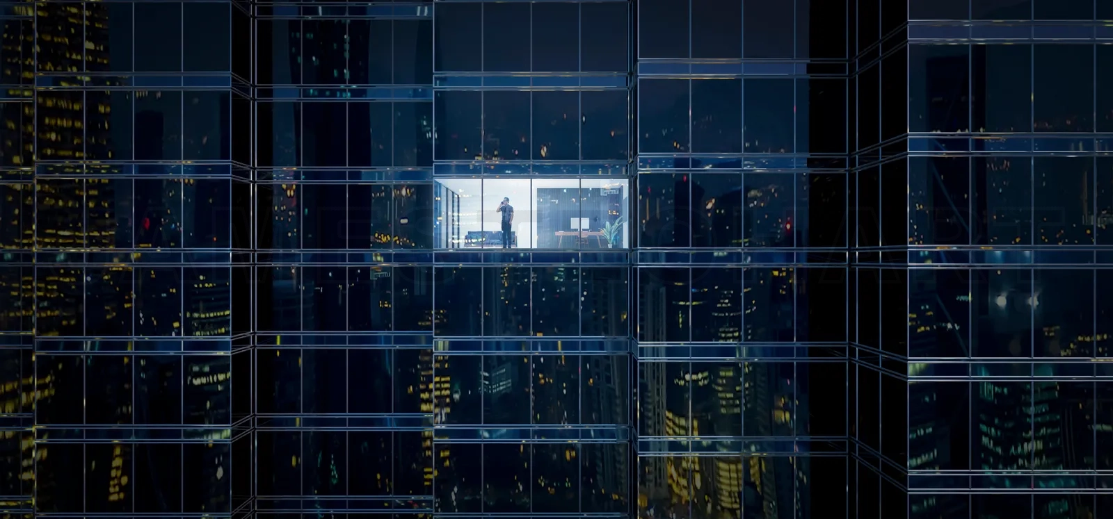 Businessman using mobile phone to talk business in office. View from the outside 3D rendering commercial skyscraper.