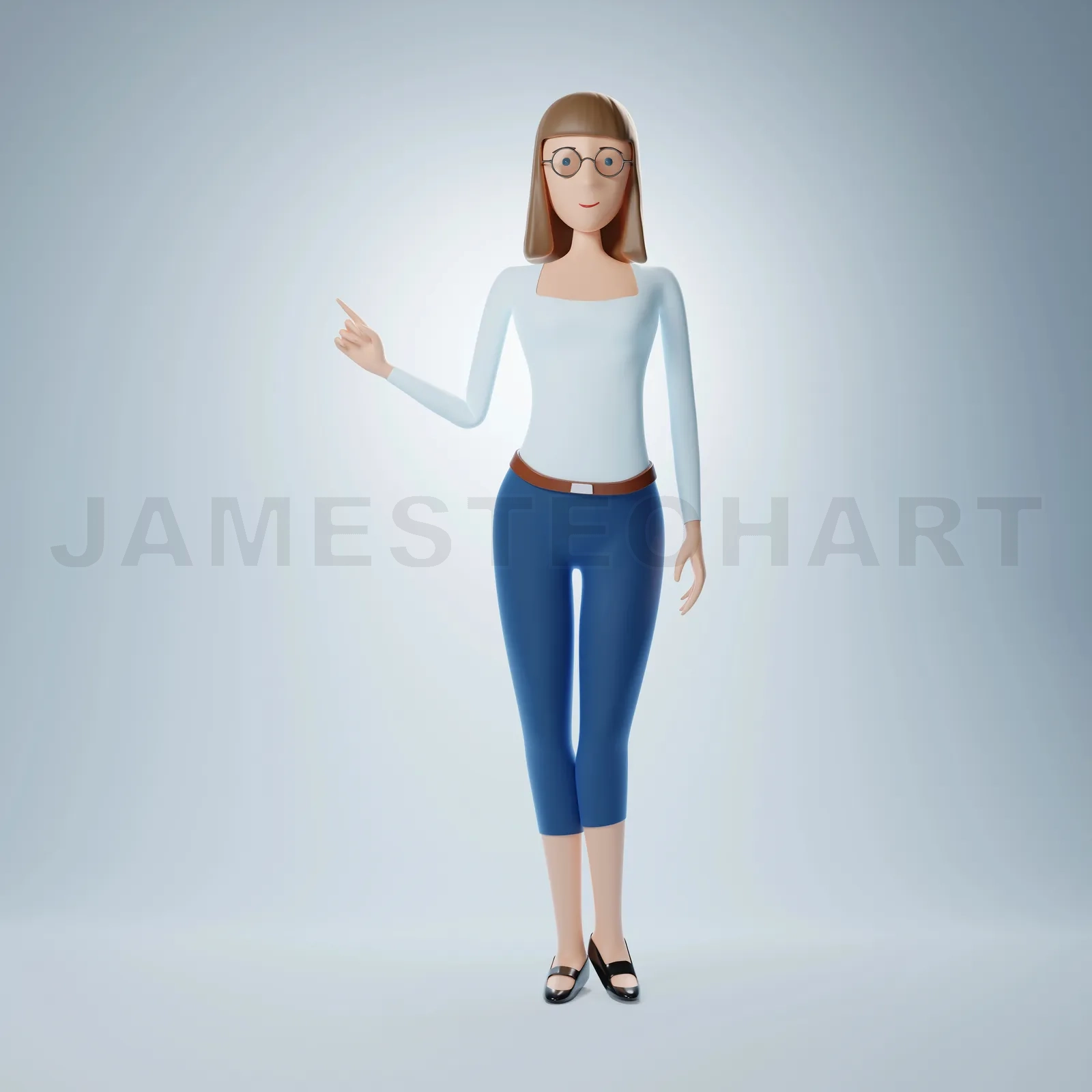 Cartoon character business woman points a finger at an empty space on white background with clipping path. 3d illustration