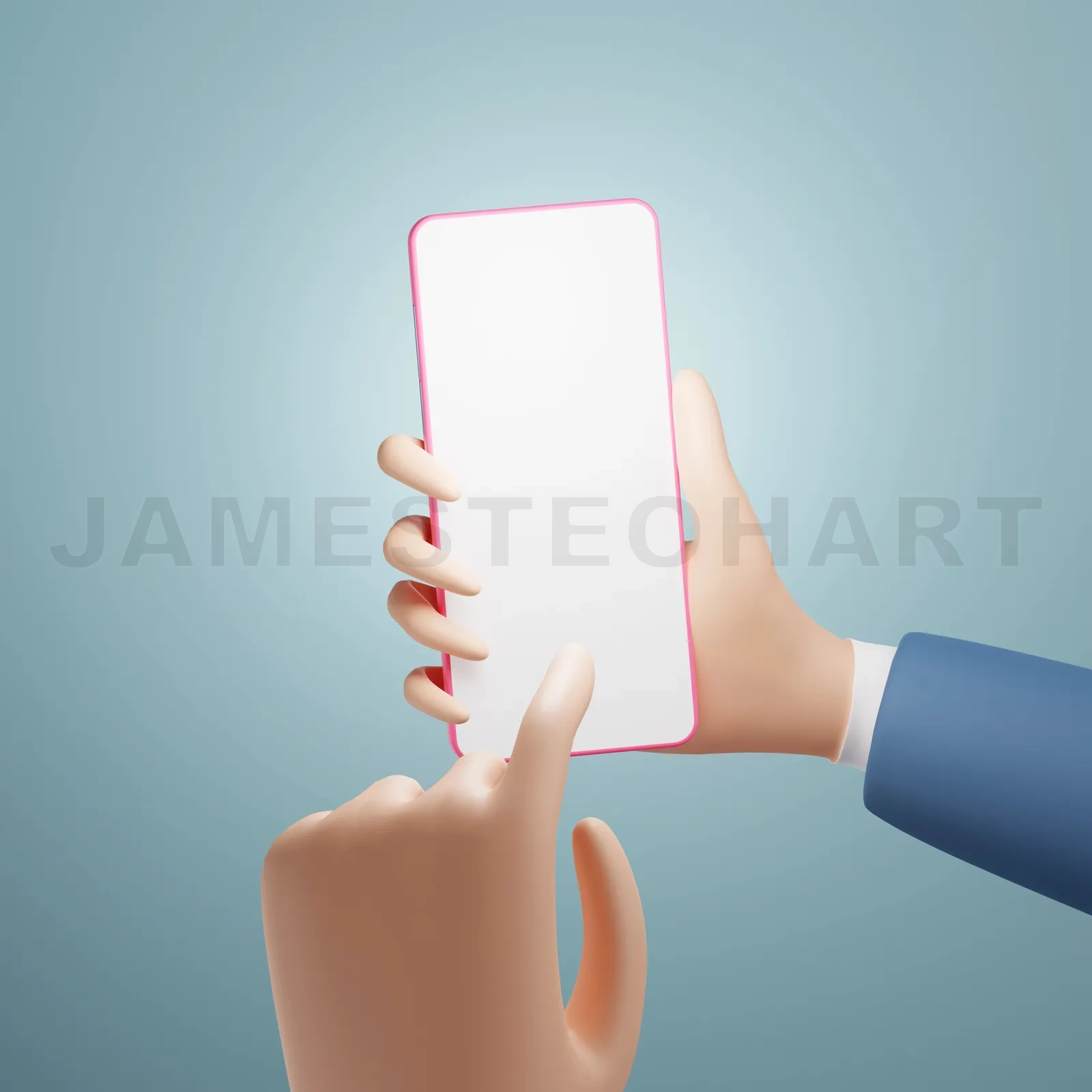 Cartoon hand using smartphone isolated on light blue background. 3d rendering