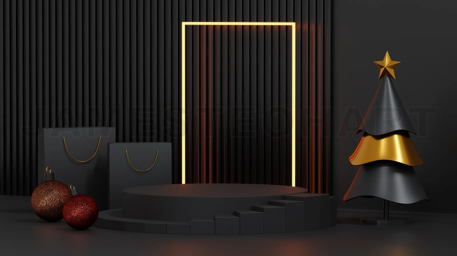 Christmas showcase decorate with stage, christmas tree and shopping bag. Concept of Christmas and New year product display platform. 3d rendering.