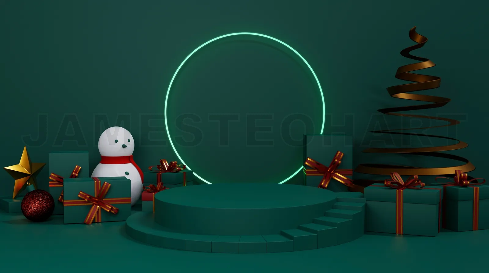Christmas showcase decorate with stage, snowman, christmas tree and gift box. Concept of Christmas and New year product display platform. 3d rendering.