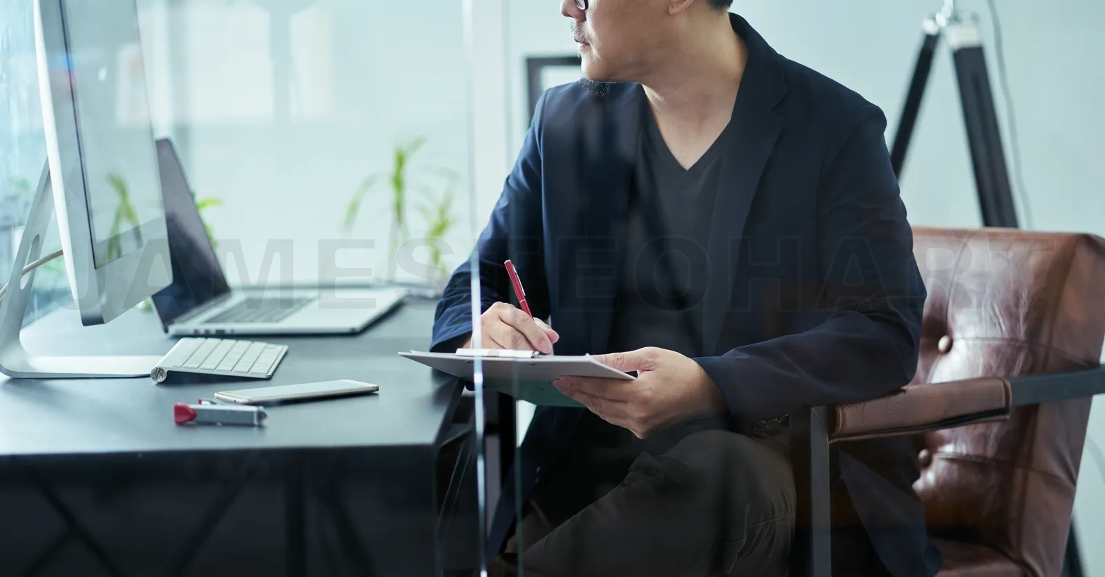 Close up businessman write marketing tips note at office