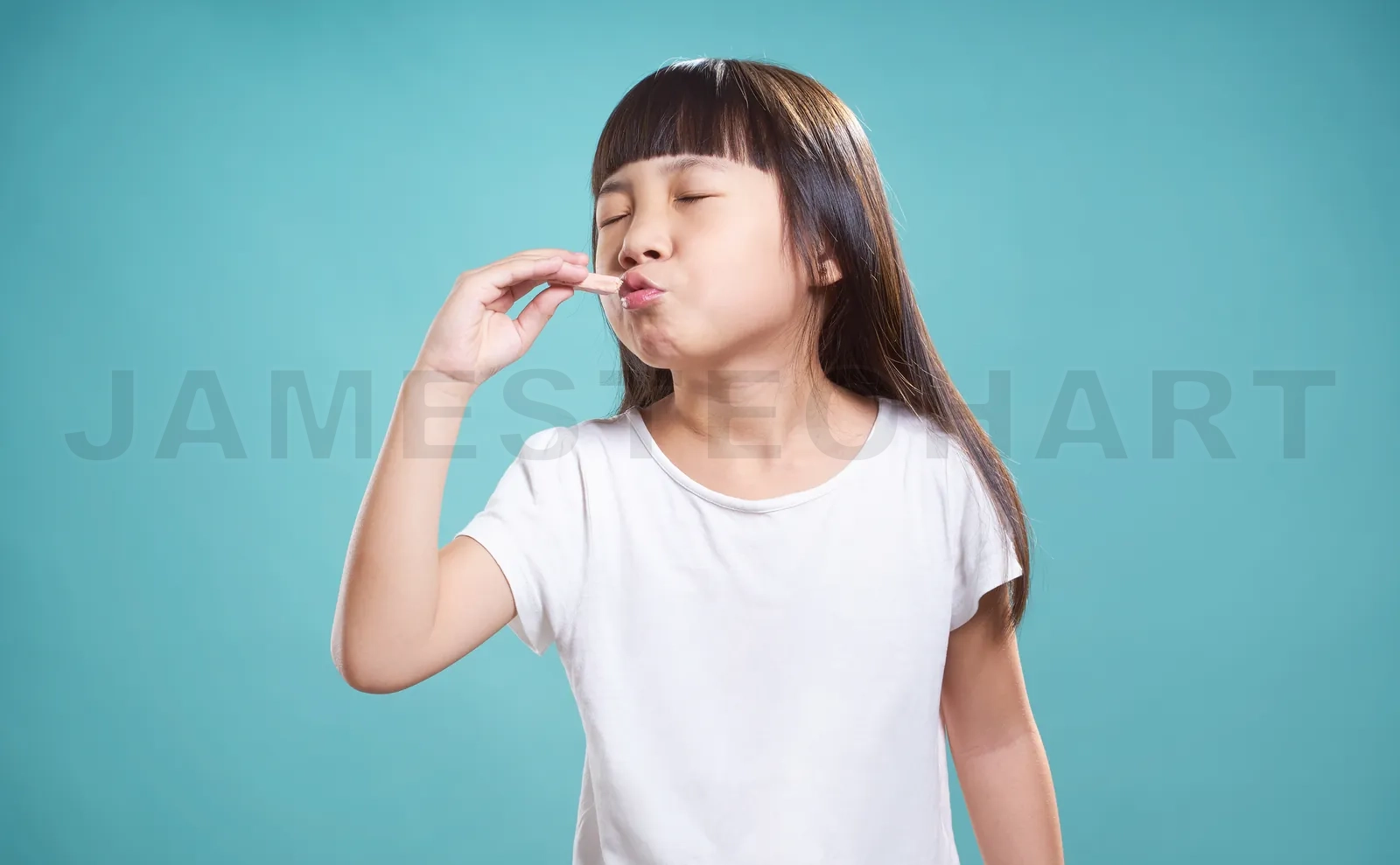 Close up portrait of asian little happy girl with good taste chocolate . isolated on light blue background .