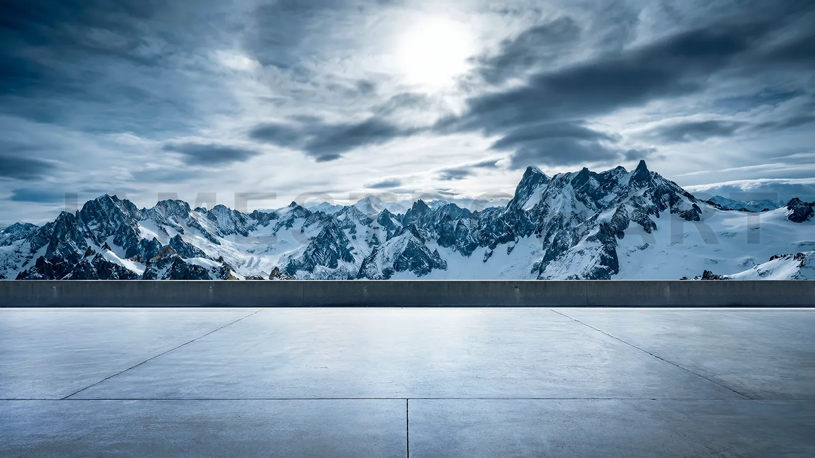 Empty concrete floor showing a dramatic panoramic view of snow-capped mountains under a cloudy sky
