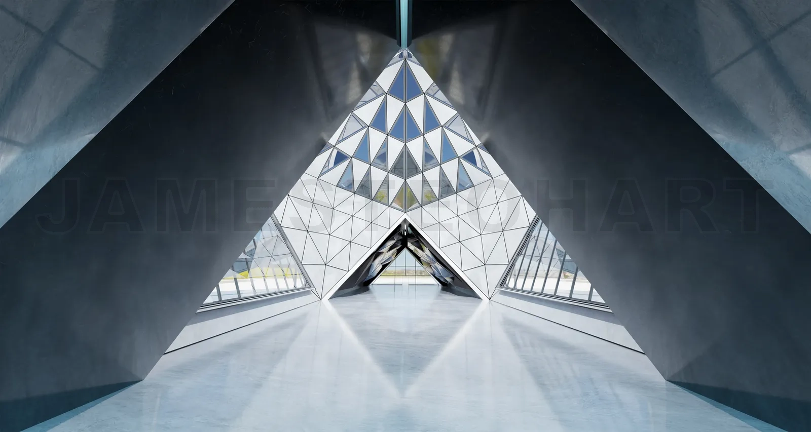 Contemporary triangle shape design modern Architecture building interior with glass, concrete and steel element. 3D rendering.