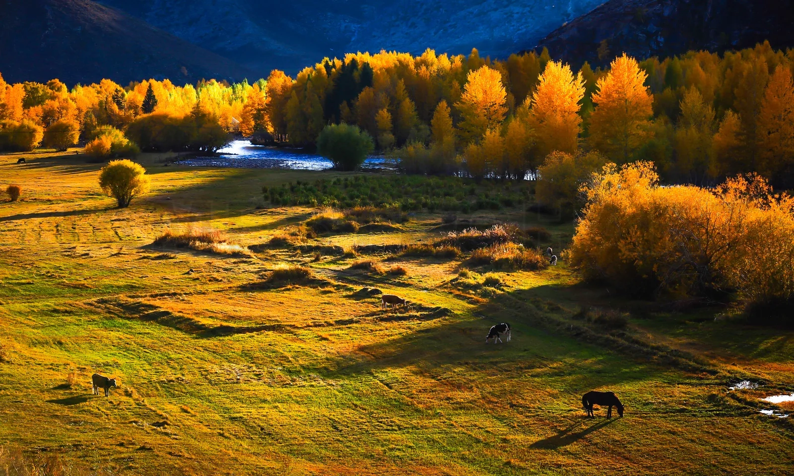 Cow and horse eating in the beautiful prairie , scenery in Xinjiang , China .