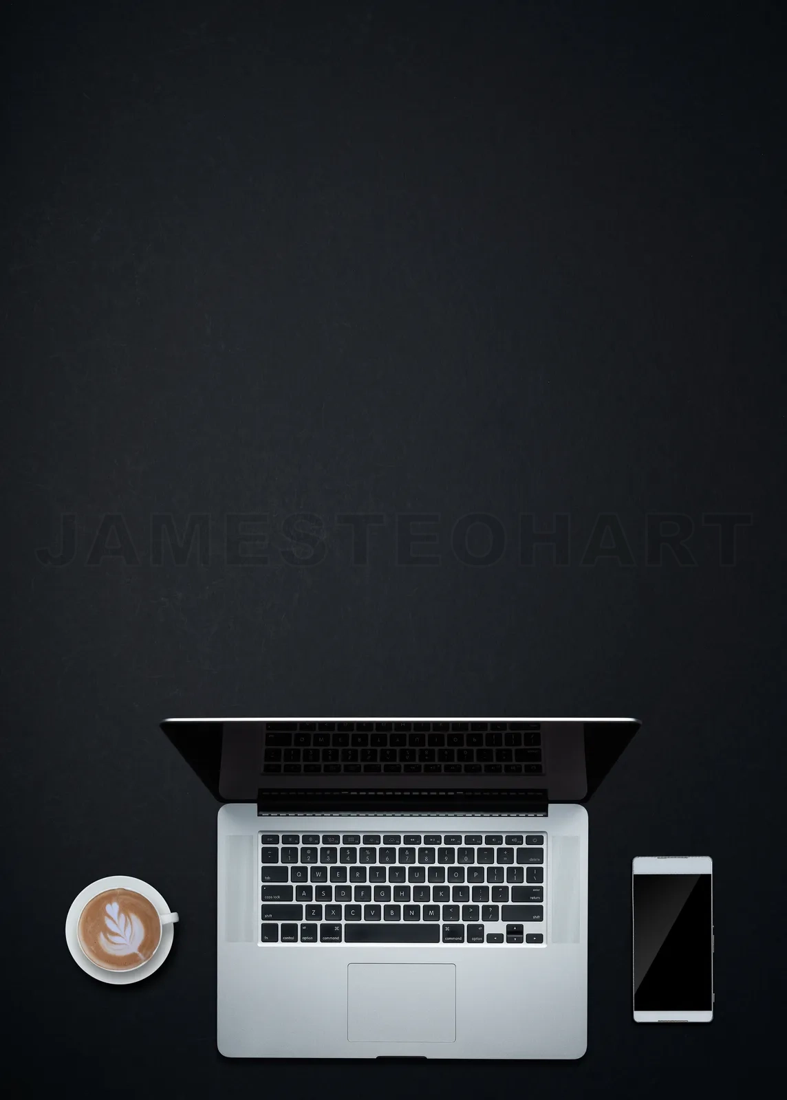 Laptop, coffee, and smartphone on a dark desk, showing a minimalist workspace