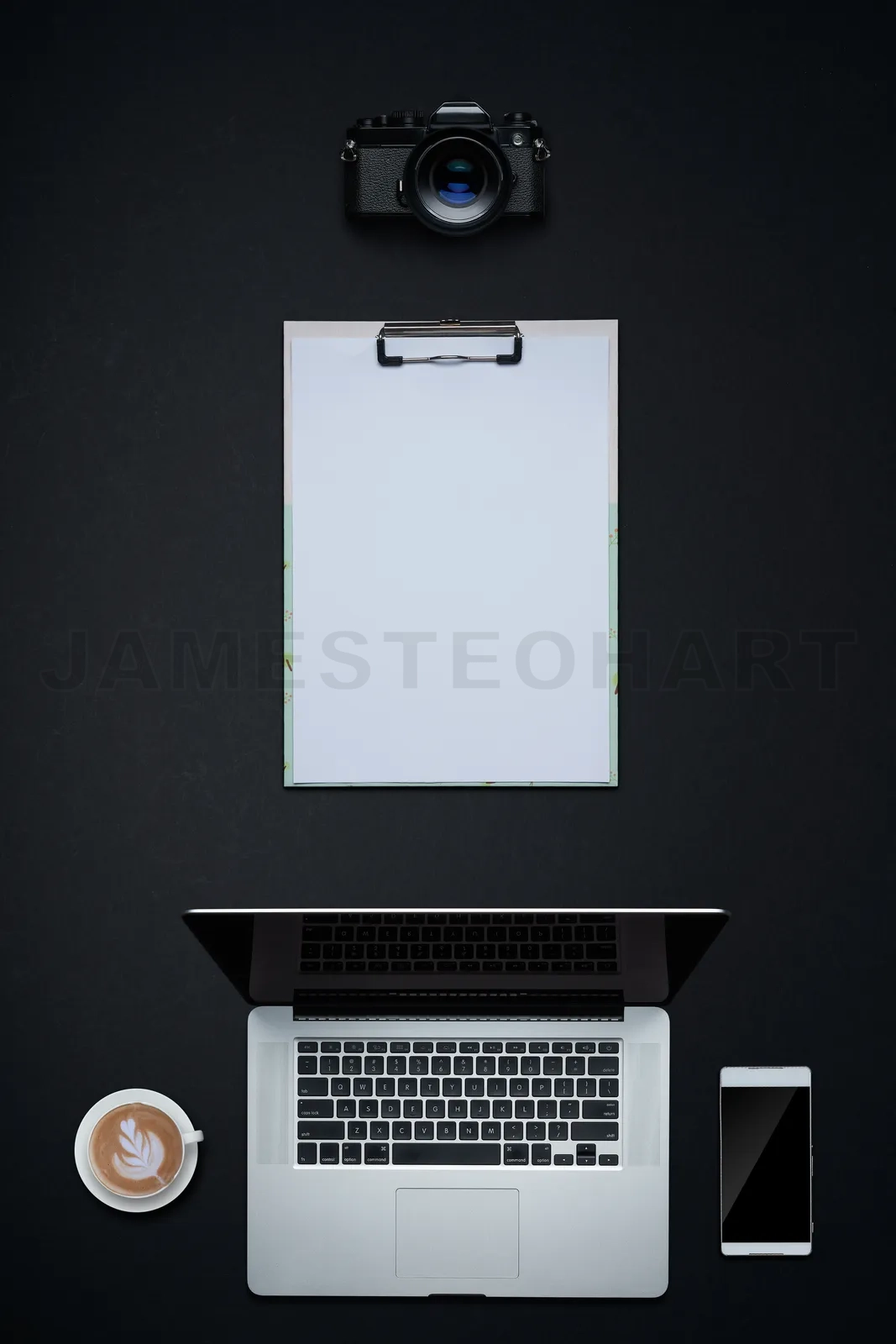 Overhead view of a modern creative workspace with camera, clipboard, laptop, smartphone, and coffee cup